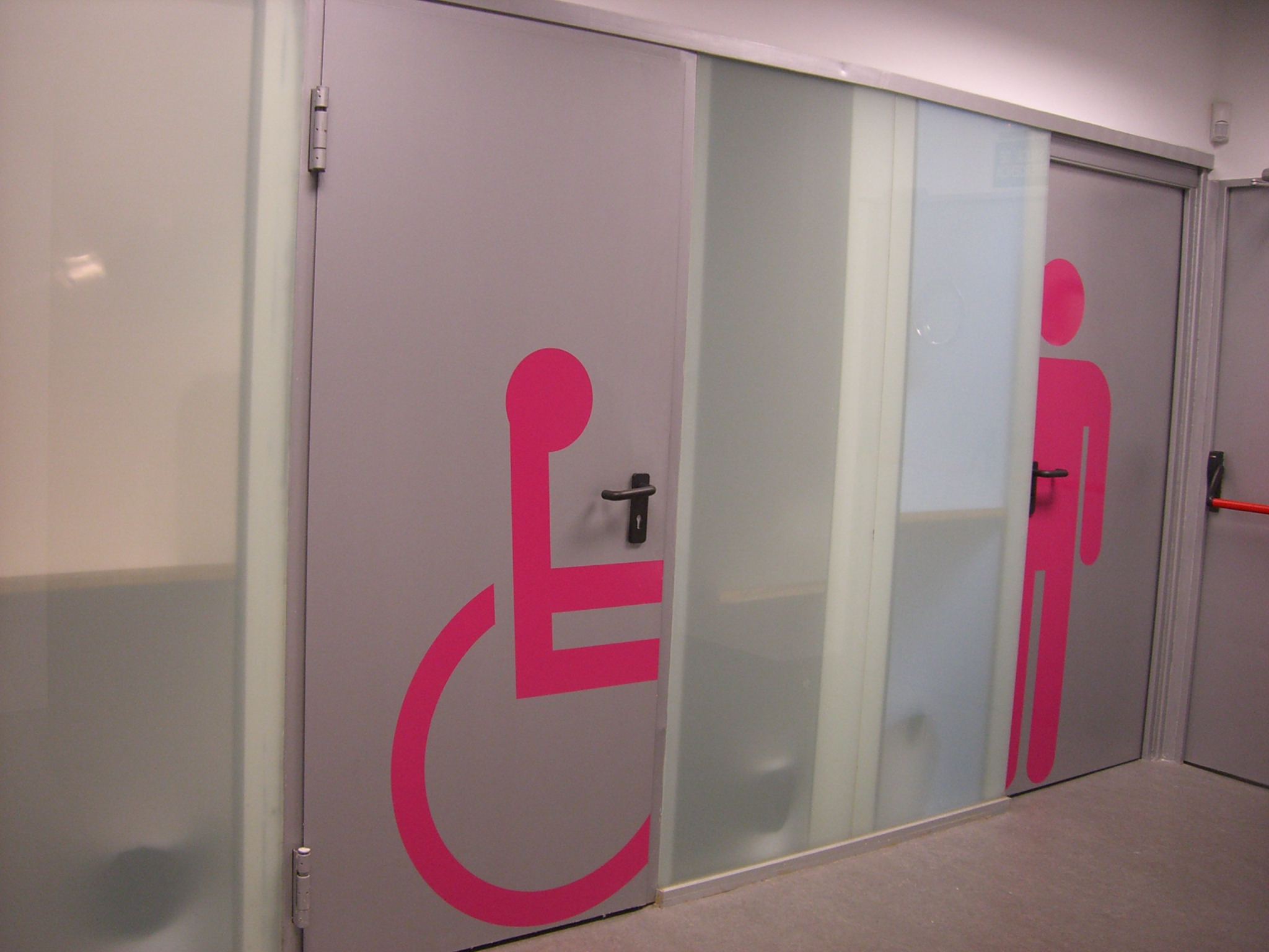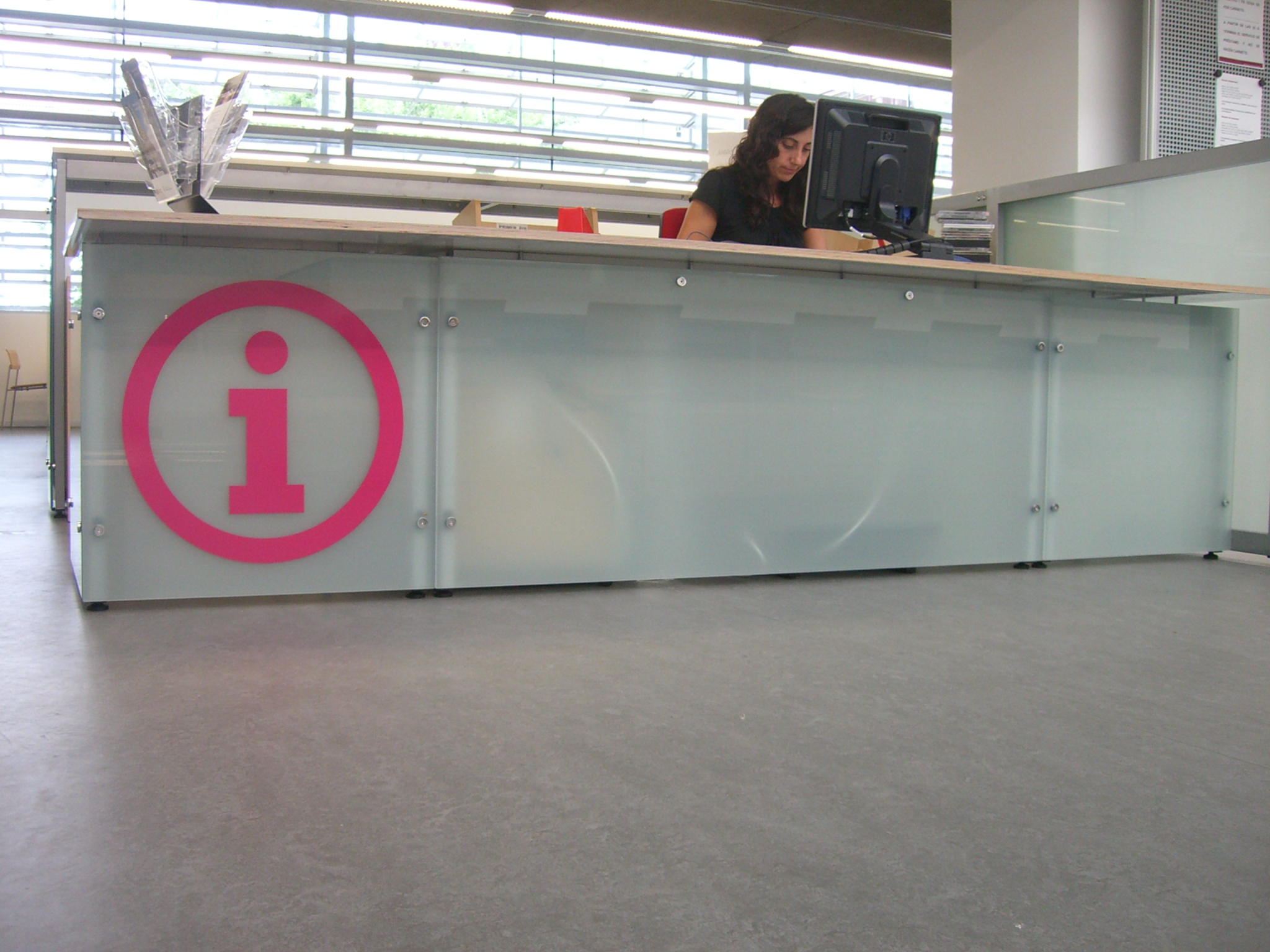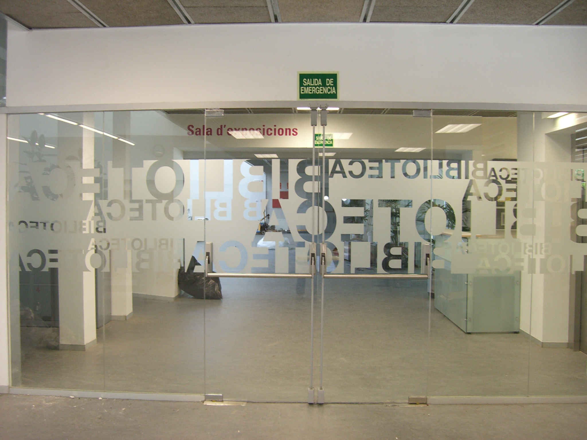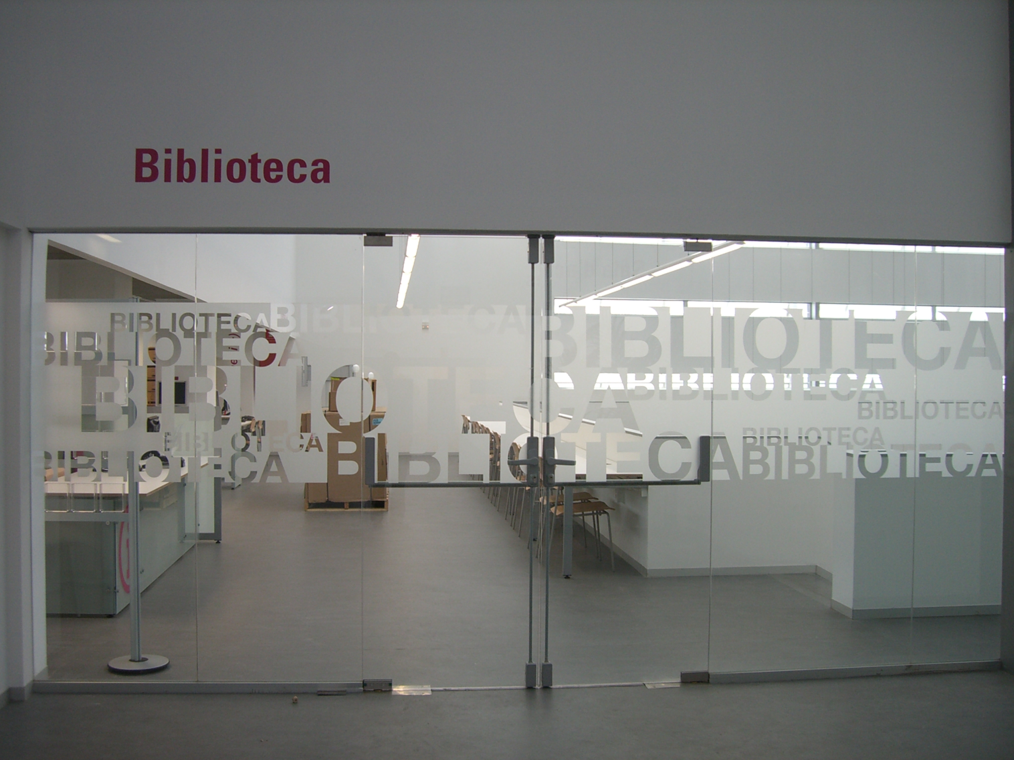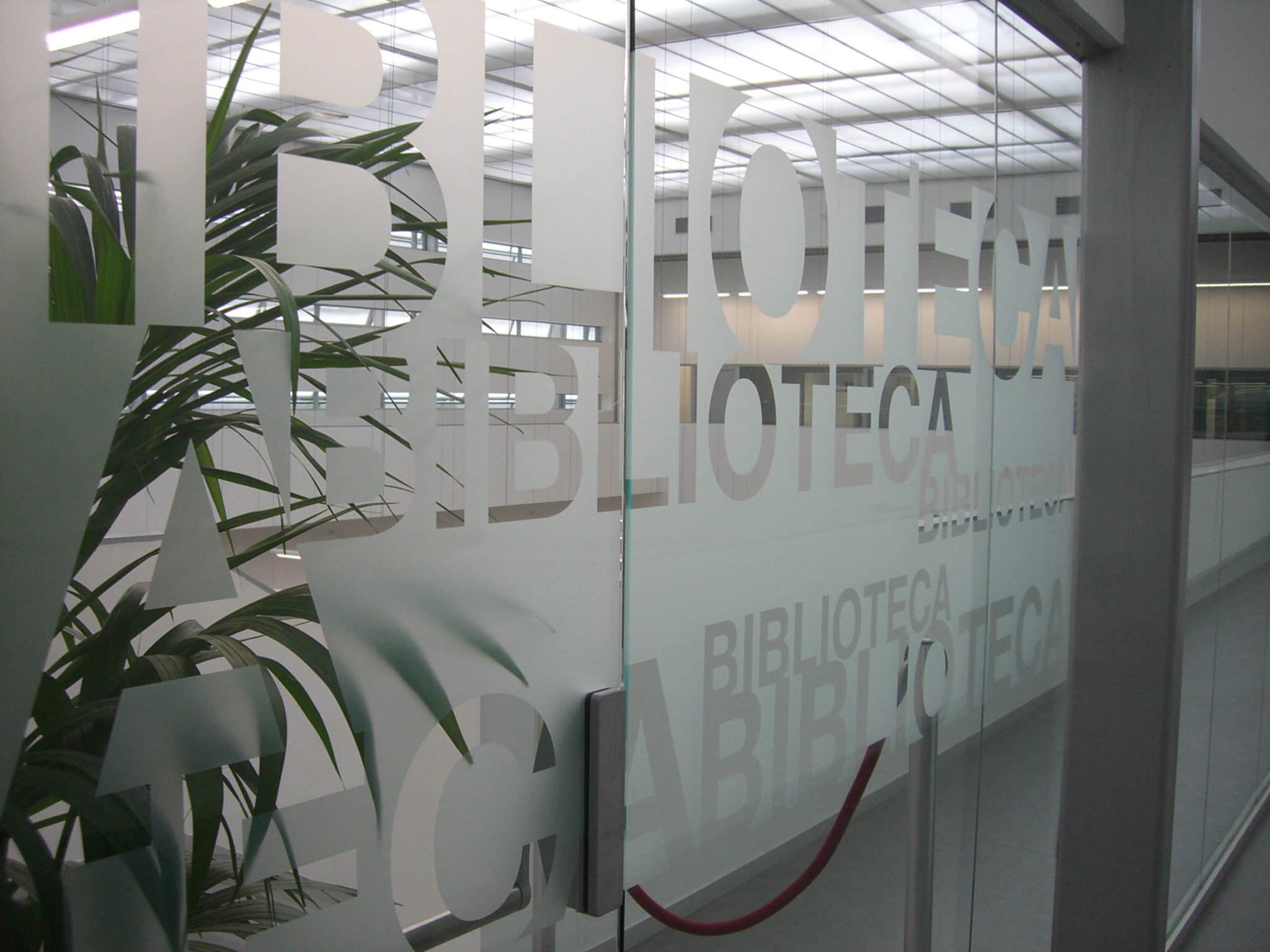El equipo de diseñadores escogió el vinilo de corte para este fin y prácticamente toda la señalización de la biblioteca se hizo con este material. El vinilo de corte nos permite trabajar tanto los formatos pequeños como los de mayor dimensión. Para el de la entrada se usan letras corpóreas de acero inoxidable con una gran resistencia a las condiciones meteorológicas adversas.