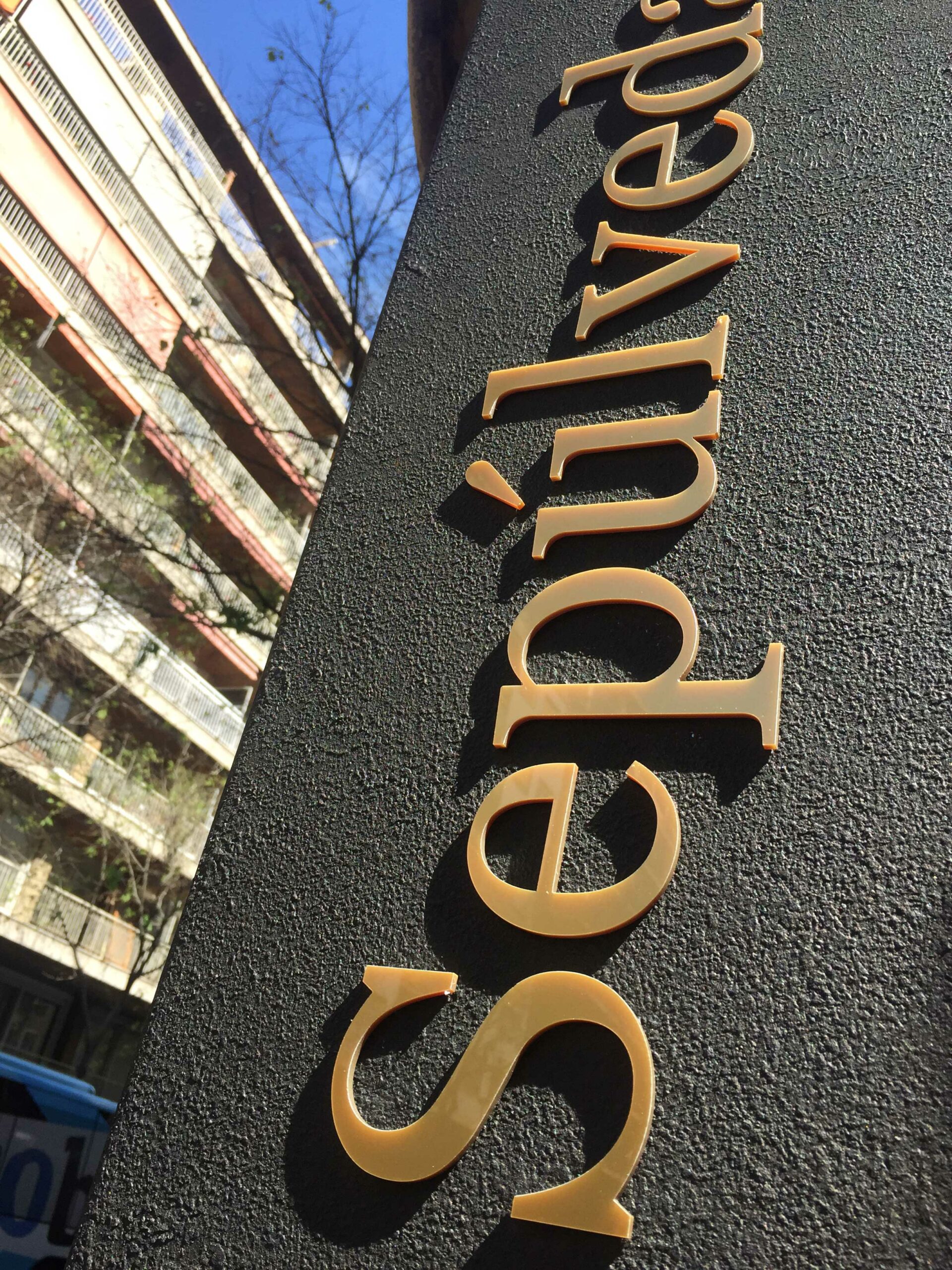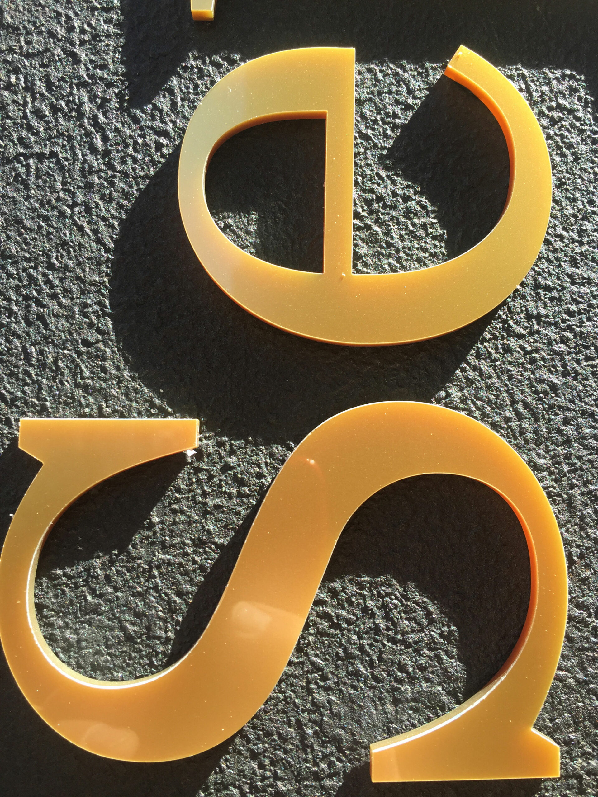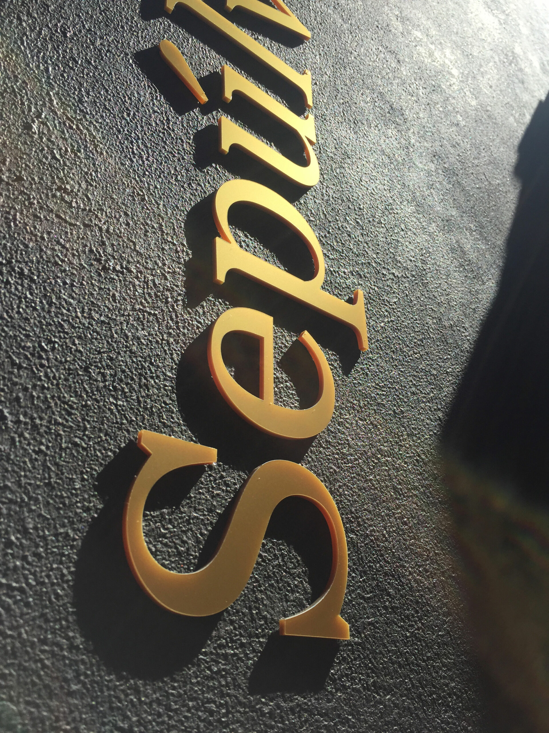 Se escogió metacrilato de color dorado para realizar el rótulo de letras corpóreas del exterior.  El metacrilato es un material muy resistente y es idóneo para ponerlo en el exterior;