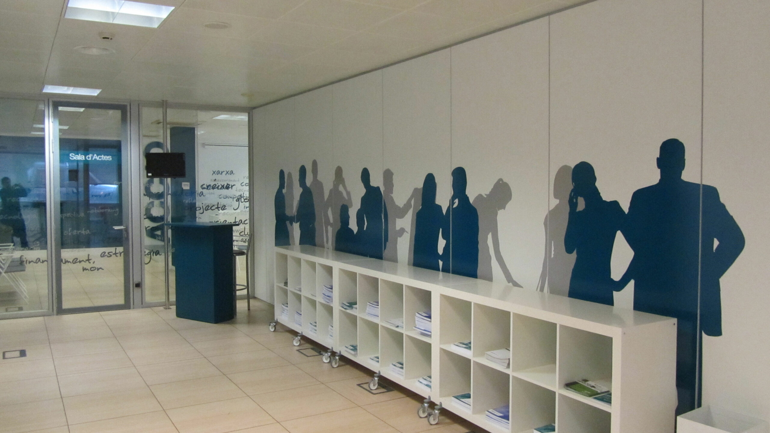 En este proyecto combinamos el vinilo de corte, el vinilo glacé las letras corpóreas recortadas y algunas placas informativas de metacrilato. Los vinilos de gran formato fueron el elemento principal en este trabajo, cumpliendo una triple función: decorativa, informativa y de creación de intimidad en algunos espacios.