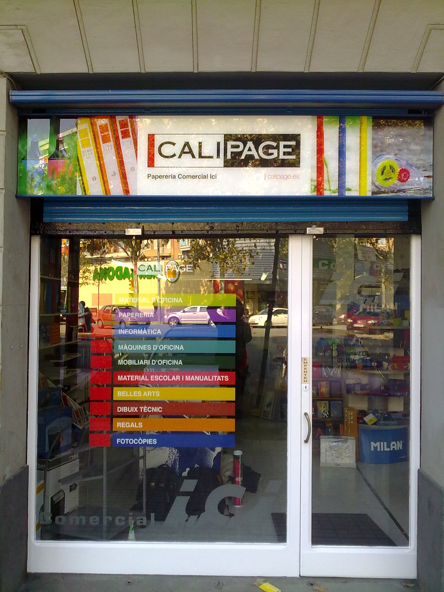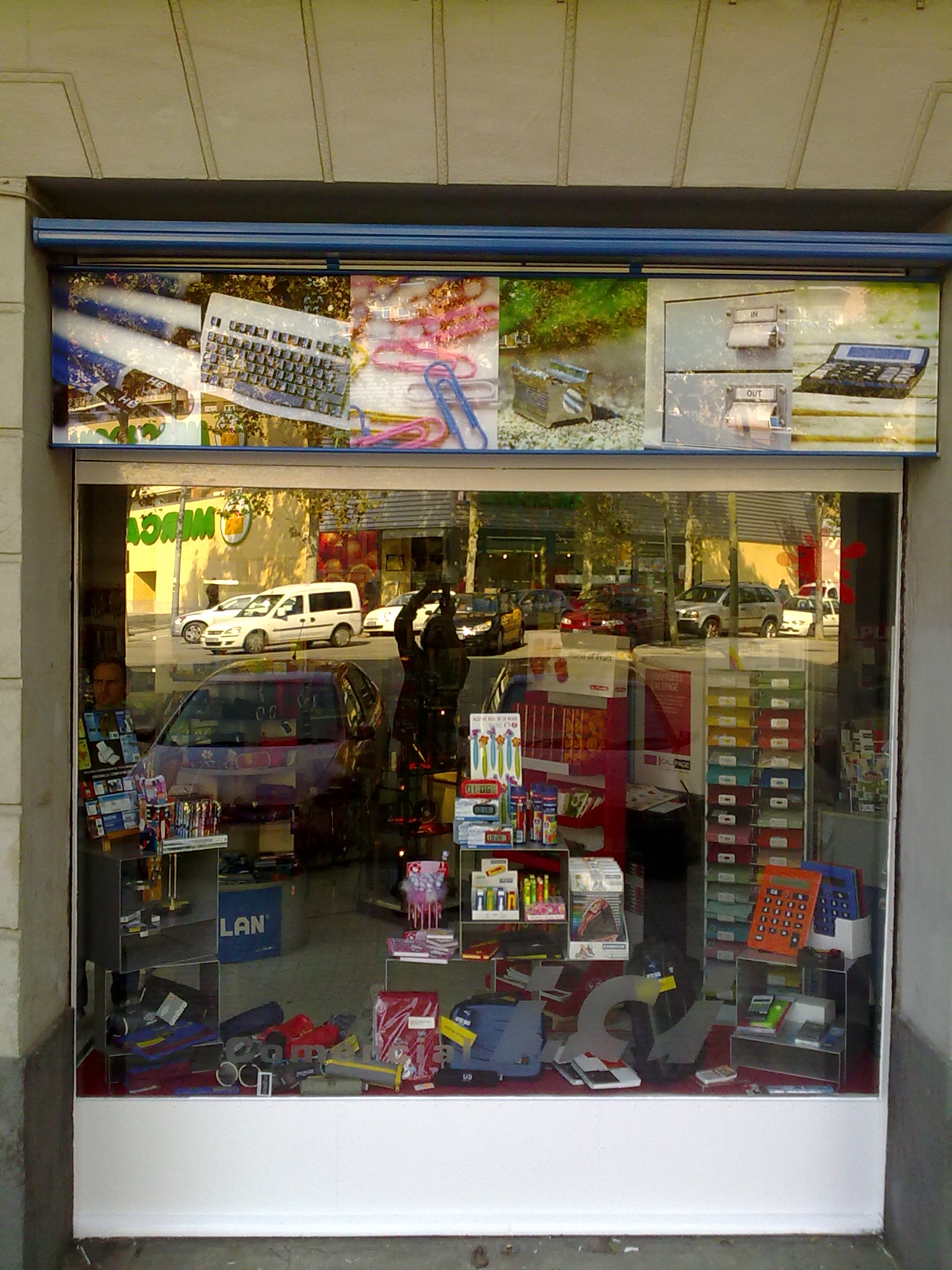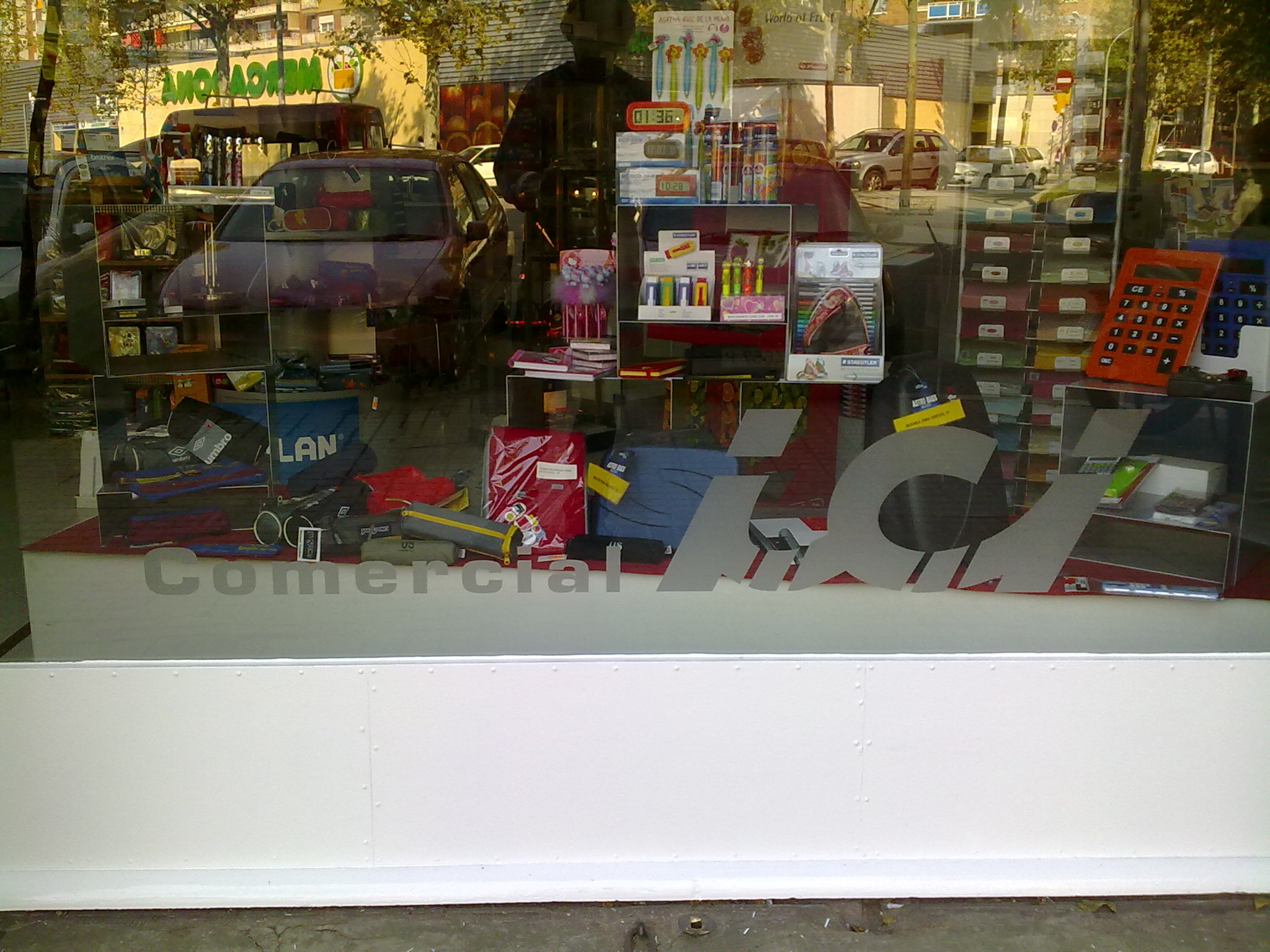 La papelería ICO o comercial ICI es cliente de Tecnimarc por más de 30 años y siempre les hemos fabricado los sellos de caucho que ellos venden en su tienda. Con la intención de renovar un poco los escaparates de su tienda no encomendaran que les hiciéramos los dos rótulos de metacrilato que se ve en las fotografías y también un vinilo de corte en las cristaleras.